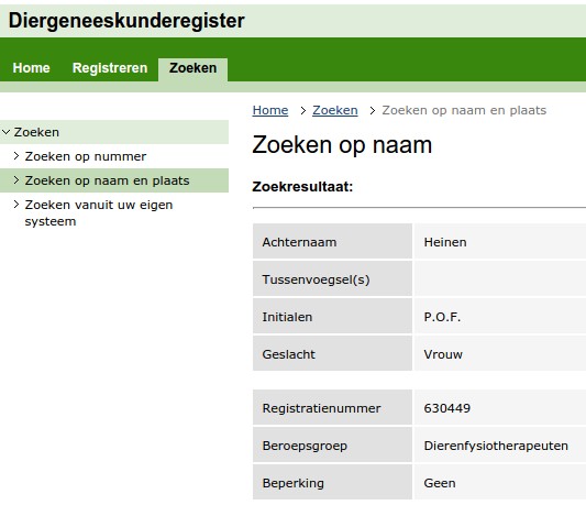 Naast mijn baan als "gewone" fysiotherapeute heb ik daarom de opleiding voor dierfysiotherapie gevolgd. Dit is een door de overheid erkende opleiding. Na het behalen van je diploma krijg je een registratie in het